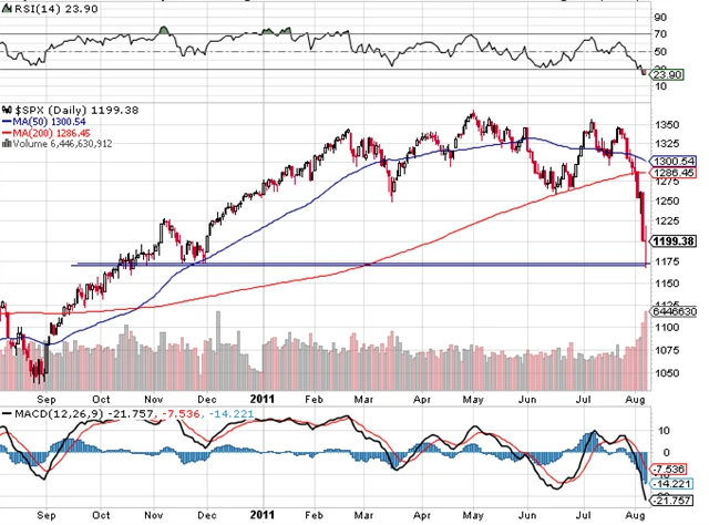Dnes se zdá takřka neuvěřitelné, že přesně před dvěma týdny byl index S&P 500 na hodnotě 1345 a zdálo se, že pravděpodobně prolomí hladinu odporu (rezistenci) a bude atakovat letošní maximální cenu. Nyní, po dvou týdnech, je index S&P 500 na hodnotě 1200 a vypadá to, že nemůže nalézt podporu. Přeprodané podmínky se nafoukly do téměř historických maxim. Vyšší hodnoty byly pouze v říjnu a listopadu 2008. Poslední dny také ukázaly, že "přeprodaný" trh automaticky neznamená "pobídku k nákupu".