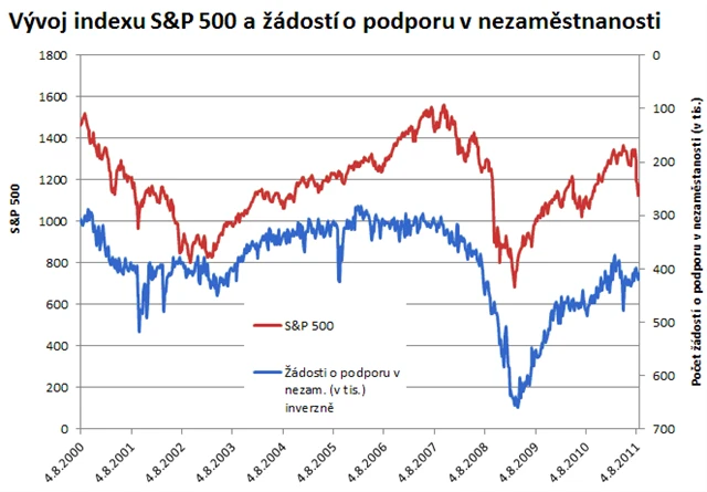 Graf znázorňuje vývoj indexu S&P 500 a počet žádostí o podporu v nezaměstnanosti. Z grafu je patrné, že mezi indexem a žádostmi existuje silná korelace. Když index klesá, žádosti rostou a vice versa. Lze tedy očekávat, že nezaměstnanost se v nejbližších týdnech bude v USA zhoršovat.