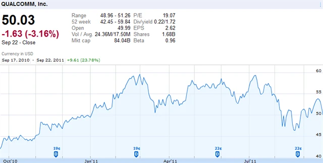 Silný mobilní průmysl znamená pro Qualcomm příjmy z licenčních poplatků za téměř každé mobilní zařízení využívající technologii 3G nebo 4G. Vzhledem k rozmachu využívání mobilních technologií a oblíbenosti chytrých telefonů se může Qualcomm těšit na stabilní růst.