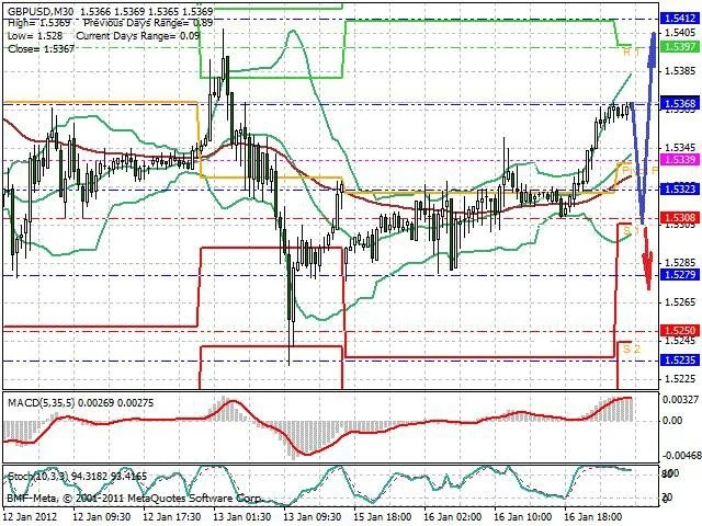 Předpokládaný pohyb pro dnešní den LONG. Případné vstupy do obchodu z hladiny 1.5305 s předpokládaným cílem 1.54, případně až 1.545. Proražení hladiny 1.5305 může vést k pohybu s pravděpodobným cílem 1.527 až 1.523.