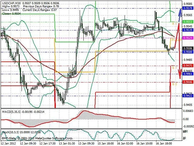 Předpokládaný pohyb pro dnešní den SHORT. Případné vstupy do obchodu z hladiny 0.955 s předpokládaným cílem 0.945, případně až 0.94. Proražení hladiny 0.955 může vést k pohybu s pravděpodobným cílem 0.957 až 0.9595.