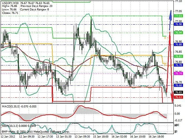Předpokládaný pohyb pro dnešní den SHORT. Případné vstupy do obchodu z hladiny 76.95 s předpokládaným cílem 76.55, případně až 76.35. Proražení hladiny 76.95 může vést k pohybu s pravděpodobným cílem 77.05 až 77.25.
