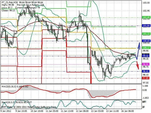 Předpokládaný pohyb pro dnešní den LONG. Případné vstupy do obchodu z hladiny 99.3 s předpokládaným cílem 100.55 případně až 101.4. Proražení hladiny 99.3 může vést k pohybu s pravděpodobným cílem 98.6 až 98.