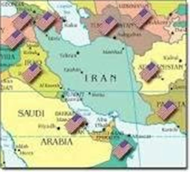 Na úvod si musíme si uvědomit, že se nehraje pouze o Írán a jeho jaderný program. Jaderný program může být záminkou. Tady se hraje o hegemonii dolaru, která je ve velké míře podporována tím, že se v dolaru obchoduje ropa. Jde o globální geopolitický boj o dolar a o moc (obrázek s označením základen Spojených států netřeba komentovat).