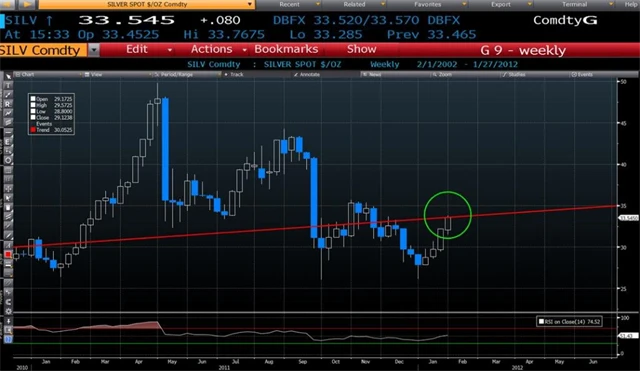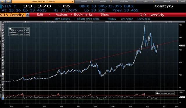 Obrázky znázorňují týdenní graf stříbra od roku 2003 (druhý graf je detail). Červená rostoucí linka spojuje důležité vrcholy v roce 2004, 2006, 2008 a 2010. Tento týden se stříbro této linky dotýká zespodu. Jedná se o úroveň 33,6 USD za unci. Jde o rezistentní úroveň, která by mohla minimálně z krátkodobého hlediska vydržet.