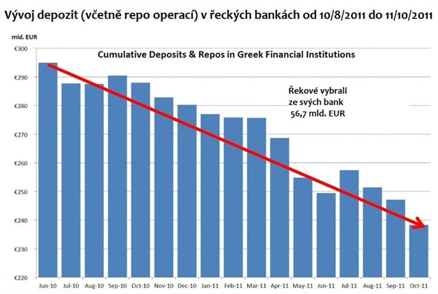 Řekové v období vrcholící dluhové krize na přelomu léta a podzimu letošního roku vybrali ze strachu ze svých bank 56,7 miliardy eur. Ukazuje to statistika Řecké centrální banky. Světová média v inkriminované době neukazovala fronty před přepážkami řeckých bank, protože výběry proběhly většinou v elektronické podobě. Většina peněz skončila v "bezpečnějších" bankách v dalších zemích Evropské unie a v zámoří.