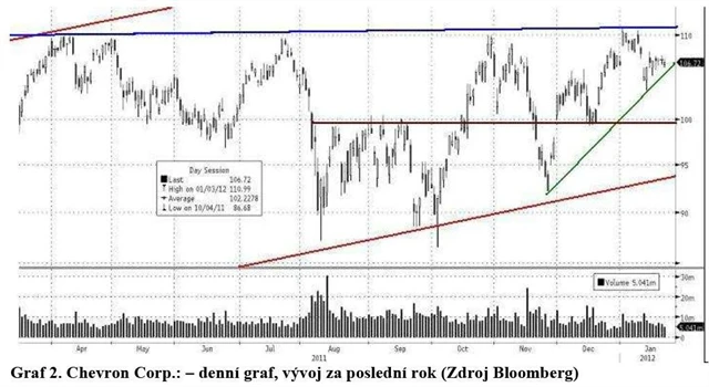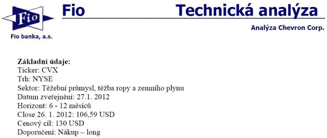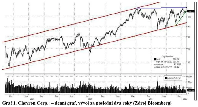 Akcie společnosti se od konce roku 2008 nacházejí v dlouhodobém růstovém trendu (červeně). Na jaře loňského roku se vyhouply na nové historické maximum poblíž 110 USD (modře), kde zároveň narazily na rezistenci v podobě horní hranice růstového kanálu (červeně). V následujících měsících jsme byli svědky konsolidace v pásmu mezi 90 USD a rezistencí v blízkosti zmiňovaných 110 USD (modře), kterou titul opakovaně testoval. Zdá se, že po téměř rok trvajícím pohybu do strany je Chevron připraven pro pokračování v cestě na sever.
