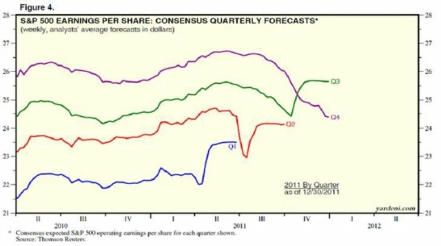 "Je zajímavé, jak podobný je vývoj odhadů s tím před třemi měsíci. Výsledky zveřejněné v říjnu překonaly odhady za celý index S&P 500 o více než dolar, což není málo, a přesto analytici pokračovaly ve snižování odhadů, zřejmě pod dojmem dluhové krize v Evropě."