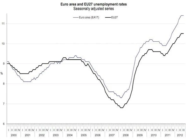 Nezaměstnanost v zemích platících eurem v srpnu stagnovala na 11,4 %, což je nejvyšší úroveň v historii. Za červenec byla čísla revidována do negativního teritoria, a to z 11,3 % na 11,4 %. Ve Španělsku je například na novém rekordu 25,1 %, nová maxima jsou realitou i v Portugalsku a Irsku. Špatnou prognózu ekonomického růstu navíc připojili v pondělí analytici z Ernst & Young. Ti pro rok 2013 odhadují růst HDP 17 zemí platících eurem na slabých 0,1 % oproti původním 0,4 %. Letos by měla recese z výkonu euroekonomik umazat 0,5 %. Následky krize bude prý eurozóna pociťovat až do konce dekády.