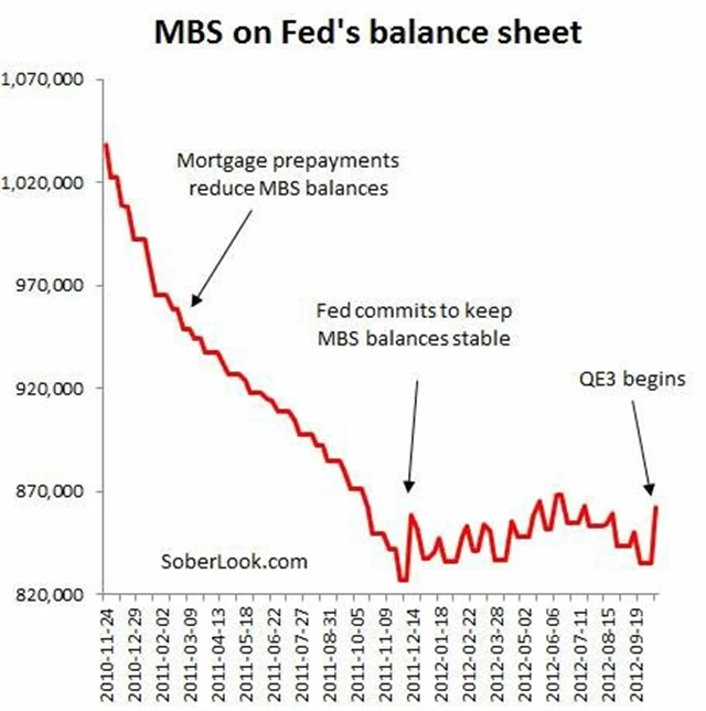 FOMC (Bernanke & spol.) zasedá od úterý do středy. Čeká se na jakékoli případné aktualizace a komentáře k probíhajícímu QE3, tedy programu odkupu hypotéčních aktiv (MBS). Jak ukazuje graf, 40 miliard za měsíc se již od září stihlo projevit v bilanci MBS na účtech Fedu.