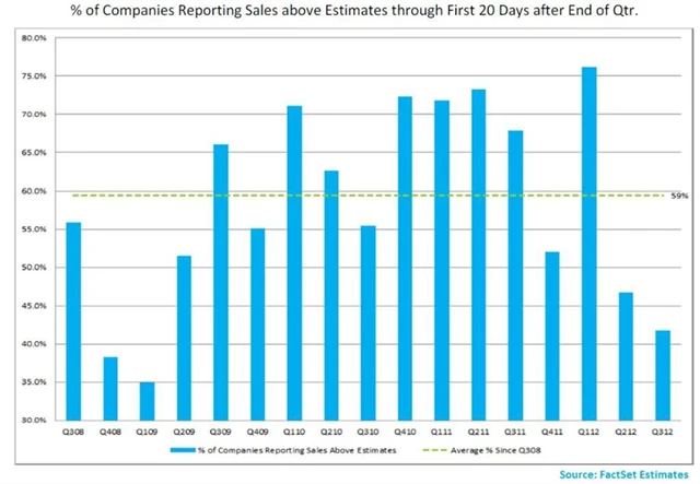 Z prvních zhruba 100 firem z indexu S&P 500, které v rámci výsledkové sezóny za třetí kvartál odhalily svá čísla, jich pouze něco přes 40 překonalo odhady analytiků na úrovni tržeb. Jde tak zatím o nejhorší statistiku od prvního čtvrtletí 2009. Během probíhajícího týdne svá čísla oznamuje přes 150 dalších velkých firem, z nich ovšem řada také nenaplnila očekávání.