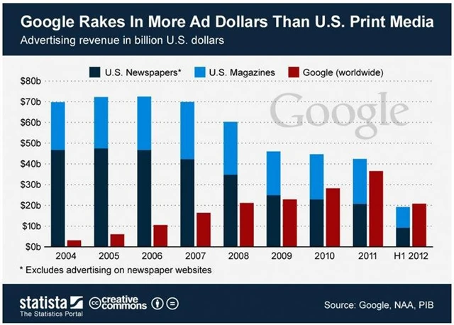 V první polovině roku 2012 Google utržil za reklamu 10,9 miliardy amerických dolarů, což je o 400 milionů více než všechny tištěné tituly v USA dohromady. Jediná společnost, která vznikla před pouhými 14 lety, tedy vydělává více než odvětí s více než stoletou tradicí.