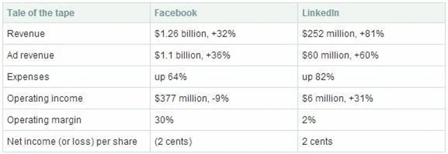 Tržby LinkedInu vzrostly o 81 % (na 252 milionů USD) ve srovnání s minulým rokem. Silný růst zaznamenaly všechny tři oblasti podnikání - inzerce, prémiové předplatné pro uživatele a online náborové služby nabízené firmám hledajícím kandidáty na pracovní pozice. Facebook zvýšil tržby "jen" o 32 % (na 1,26 miliardy USD), drtivou většinu zajistily příjmy z reklamy a za zbytkem stál platební systém. Facebook je na základě tržeb stále pětkrát větší než LinkedIn, avšak LinkedIn roste 2,5násobně rychlejším tempem než jeho konkurent.