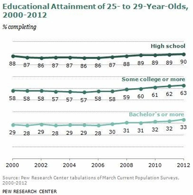 Vzdělanost amerických mladých dospělých se postupně zvedá od roku 2007, kdy byla ekonomika Spojených států na hraně recese. Analytici to připisují především menší poptávce na pracovním trhu, který byl krizí mezi lety 2007 a 2009 zasažen nejcitelněji. Středoškolští studenti se tak raději než na nestabilní trh práce rozhodli nastoupit na univerzity a dále se vzdělávat. Kromě odložení problému se sháněním zaměstnání je motivovalo lepší postavení na trhu práce, jež jim zajistí vysokoškolský titul.
