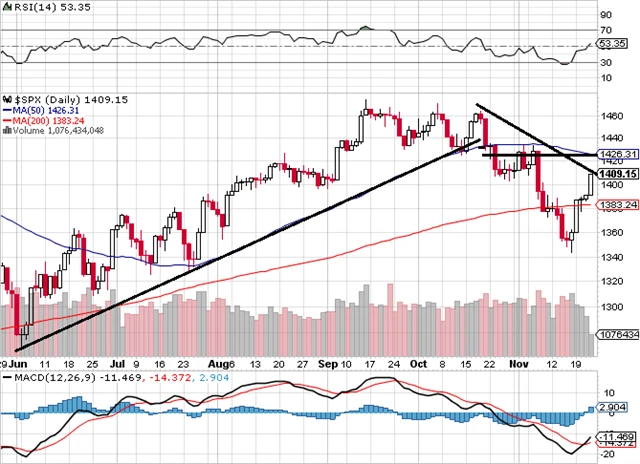 Index S&P 500 v týdnu posílil o 3,6 % a v pátek se po dvou týdnech vrátil nad 200denní klouzavý průměr a nad 1 400 bodů. Přitom index trvale klesal od poloviny října, do pátku 16. listopadu ztratil 125 bodů. Je to dost, ale ještě nic hrozivého.