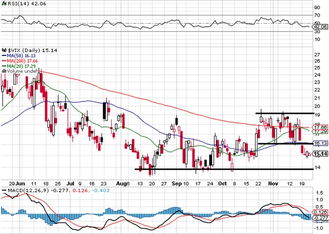 Index volatility VIX klesal a vrátil se pod 17 bodů, což je pro akciový trh povzbudivá zpráva. V pátek uzavřel na 15,14 a blíží se ke korekční hladině 14.