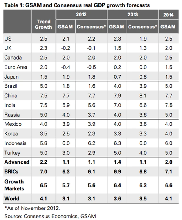 Nejprve čísla. O'Neillův výhled růstu HDP je ve sloupcích označených GSAM.