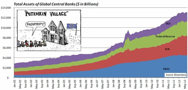Největší problémy světové ekonomiky (velké dluhy, pomalý růst) a jejich řešení zaměstnávají ekonomy a politiky již několik let. Kyle Bass z Hayman Capital má jasno - jakékoli oživení na trzích nebo v ekonomice živené tiskárnami peněz v centrálních bankách mohou krátkodobě vyvolat pocit bezpečí a uspokojení, ale dlouhodobě nafukují obrovskou bublinu v jejich bilancích. Potěmkinova vesnice jako vystřižená ze sovětské učebnice.