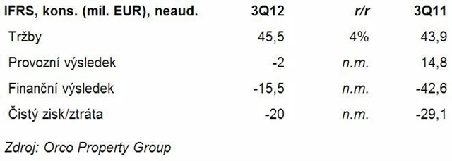 Tržby společnosti ORCO vzrostly ve třetím čtvrtletí 2012 meziročně o 4 % na 45,5 milionu eur, a to především díky vyšším příjmům z hotelového segmentu v Chorvatsku a větším výnosům z developmentu. Firma se však ve čtvrtletí dostala do provozní ztráty 2 miliony eur kvůli znehodnocení zaúčtovanému u německého projektu Sky Office (13 milionů).