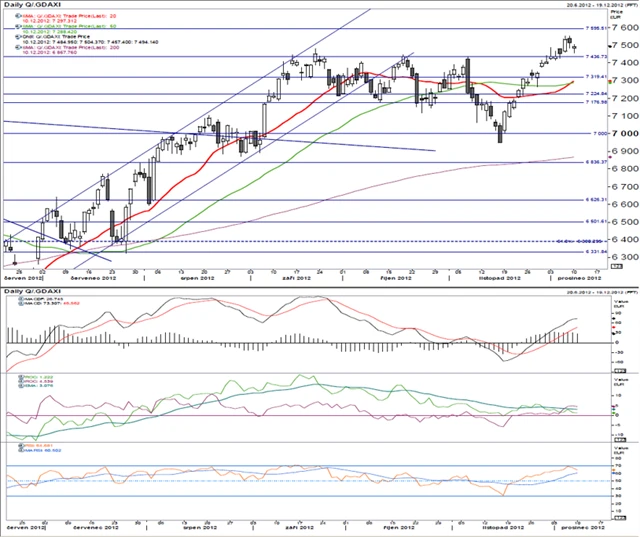 Indexu se podařilo překonat předchozí trojnásobný vrchol okolo 7 437 bodů, který nyní působí jako úroveň podpory. 20denní klouzavý průměr protíná 50denní zespodu. MACD pokračuje v růstu (nad spouštěcí linií) a udržuje si svůj odstup. ROC20 se vyvíjí víceméně do strany v mírně pozitivním pásmu, RSI se na chvilku dotklo hranice překoupenosti (na 70 bodech).