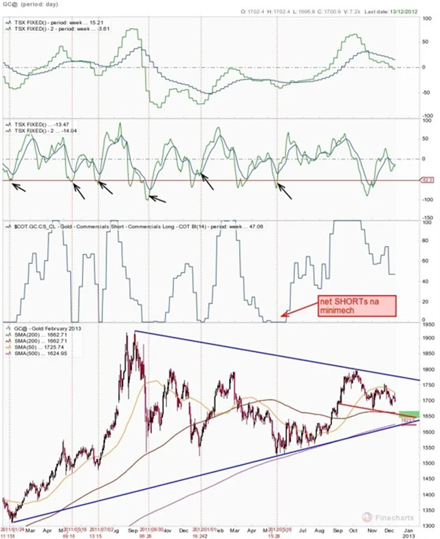 Skupina Commercials (těžební a zpracovatelské firmy) je nejvýznamnější skupinou při určení toho, kam se bude cena zlata ubírat. Černé šipky ukazují typické nákupní situace v minulosti. Vždy, když držely na futures trhu Commercials výraznou převahu LONG pozic (spekulanti drželi SHORT pozice) a zakreslený oscilátor TSX ve druhém grafu shora obrátil k růstu zpod úrovně -50 bodů, došlo k mnohatýdennímu růstu ceny zlata.