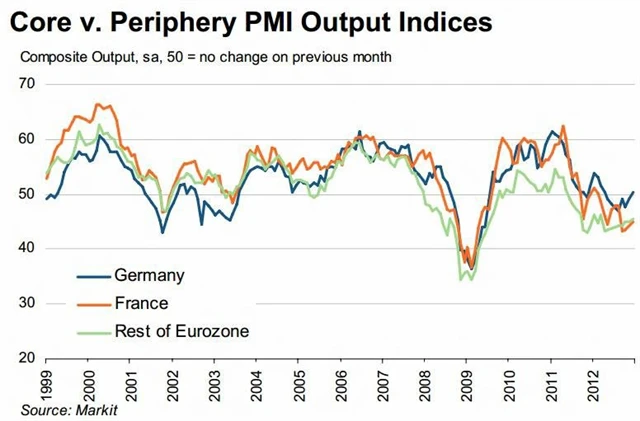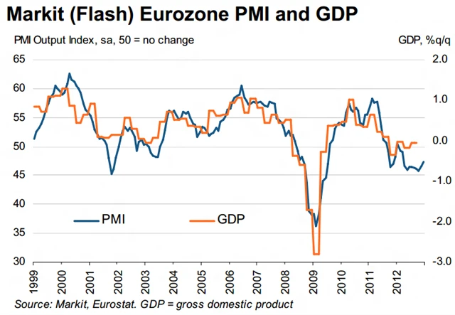 Celkový index PMI za eurozónu vzrostl na 47,3 bodu (v listopadu 46,5 bodu), ve službách na 47,8 bodu (v listopadu 46,7 bodu) a ve zpracovatelském průmyslu na 46,3 bodu (v listopadu 46,2 bodu). Průmysl je tedy stále slabinou evropské ekonomiky.