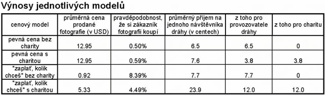 Překvapila ale poslední varianta, tedy "zaplať, kolik chceš" v kombinaci s charitou. Ve srovnání s předchozí kombinací (dobrovolná cena bez charity) průměrná cena opět stoupla, a to téměř 6krát na 5,3 USD. Prodalo se ale dvakrát méně fotografií.