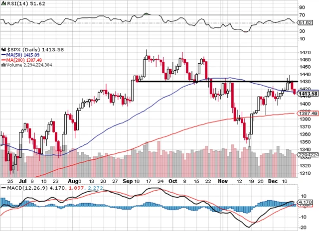 Závěrečná hodnota indexu S&P 500 byla v pátek 7. prosince 1 418,07 bodu, o týden později 1413,58 bodu. Po dvou růstových týdnech tedy přišla mírná korekce o 0,3 %, ale stále se obchoduje v úzkém rozpětí. Hlavní americký akciový index ale od začátku roku udržuje zisk přes 12 %.