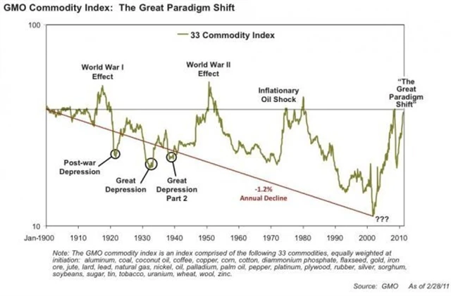 Během posledních 100 let jsme byli svědky dlouhodobého sestupného trendu cen některých komodit, za nímž stály neustále se rozvíjející technologie usnadňující přístup k jejich zdrojům. Dle Granthama bychom se však již pokračování poklesu cen dočkat neměli, naopak.