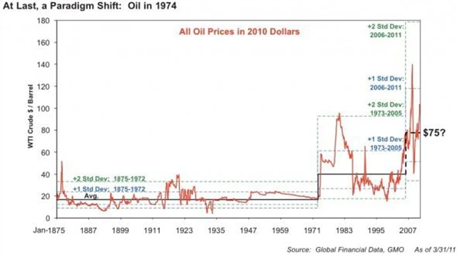 Tento graf mluví sám za sebe. Celých 100 let od roku 1875 se průměrná cena ropy pohybovala kolem 16 USD za barel. Následně překročila poptávka po černém zlatě nabídku a průměrná cena se posunula na 35 USD za barel. Aktuální cena ropy okolo 100 USD za barel posouvá dlouhodobé průměry ještě výše.