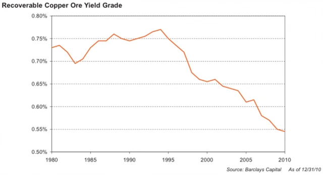 Těžba kovů se obecně podobá příběhu ropy. Povrchové doly začínají bít na poplach spolu s klesajícími zásobami železné a měděné rudy a procentuální výnosnost rudy z tuny vytěženého materiálu směřuje děsivým tempem k jihu.