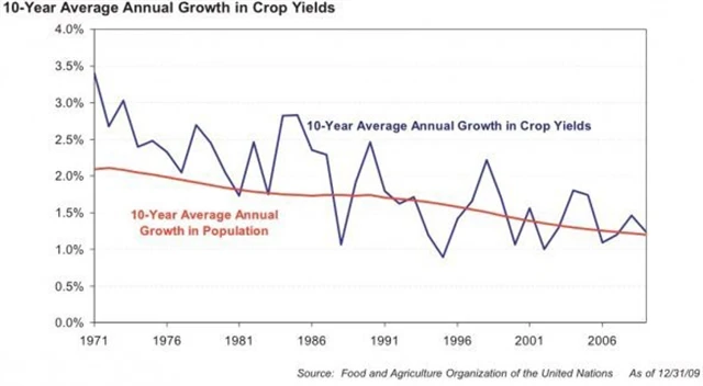 Pozadu s poklesem výkonnosti nezůstává ani zemědělství, respektive průměrná produkce potravin z jednoho akru půdy. Ještě před 40 lety se roční růst výnosnosti pohyboval kolem 3,5 %, tedy asi 1,5 % nad průměrným růstem světové populace. Dnes se však obě čísla neustále přibližují, přičemž potraviny již ročně přidávají pouze kolem 1,5 %. Děsivá je i skutečnost, že pro zemědělství nemusí být ani záporné hodnoty zcela nereálné.