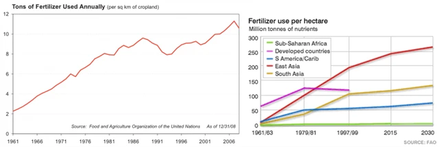 Za meziročním (byť zpomalujícím) růstem výnosnosti potravin z akru půdy je především využívání hnojiv. Jejich průměrná celosvětová spotřeba dosáhla za čtyři desetiletí od roku 1960 pětinásobných hodnot. Udržet tyto trendy nicméně nebude možné navždy. Již sám fakt, že řada hnojiv samotných je založena na komoditách (například draslíku), napovídá, že i možnosti využívání hnojiv mají své limity.