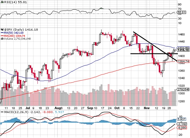 Závěr: Index S&P 500 dokázal listopad uzavřít v mírném plusu, i když v polovině měsíce byl -4,7 %. Nejbližší rezistence jsou na 50denním klouzavém průměru (1 423) a na 1 430 bodech (listopadová maxima). Na spodní straně jsou určující ceny 1 385 (minimum z minulého týdne a 200denní klouzavý průměr) a 1 380 bodů, která začátkem listopadu zafungovala jako support.