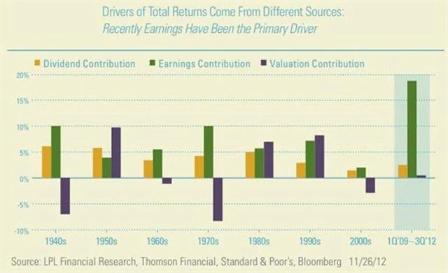 Ukazuje to i graf, který ve svém ročním výhledu použil Jeff Kleintop z LPL Financial. Růst cen akcií "živený" růstem zisků firem na akcii spadá do kolonky "earnings contribution" (P/E se nemění), zhodnocení akcií spadající do "valuation contribution" znamená, že rostla valuace (zhodnocení na základě sentimentu a jiných fundamentů než firemní ziskovosti). Třetí pilíř návratnosti akcií tvoří dividendy.