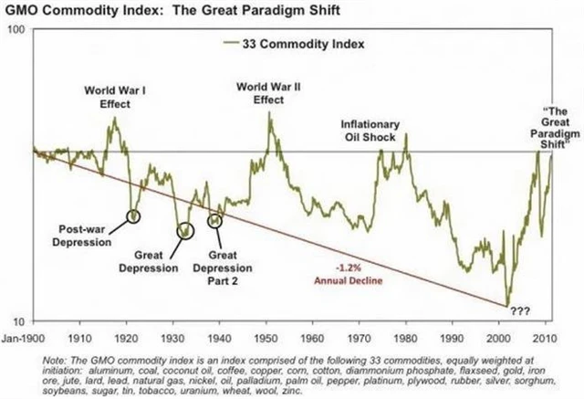 Od začátku 20. století se ceny komodit pohybovaly v sestupném trendu, který narušily jen extrémní události typu druhé světové války. Jeremy Grantham z GMO varuje, že růst světové populace (až k 10 miliardám v roce 2100) společně se změnou trendu na světovém trhu se surovinami a potravinami může vyústit v katastrofu doslova biblických rozměrů.