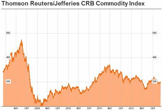 Ceny komodit sledujeme průběžně, ale pro ty, kdo by se cítili "ošizeni" grafem od Jeremyho Granthama (končí na jaře 2011), pro jistotu jeden ze sledovaných komoditních indexů a jeho vývoj za uplynulých pět let.
