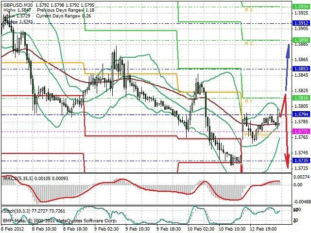 Předpokládaný pohyb pro dnešní den SHORT. Případné vstupy do obchodu z hladiny 1.582 s předpokládaným cílem 1.5725, případně až 1.57. Proražení hladiny 1.582 může vést k pohybu s pravděpodobným cílem 1.5845 až 1.5885.