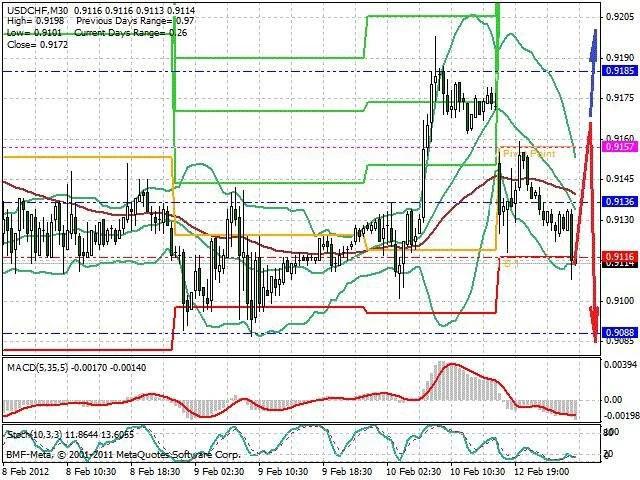 Předpokládaný pohyb pro dnešní den SHORT. Případné vstupy do obchodu z hladiny 0.9165 s předpokládaným cílem 0.9085, případně až 0.906. Proražení hladiny 0.9165 může vést k pohybu s pravděpodobným cílem 0.92 až 0.923.