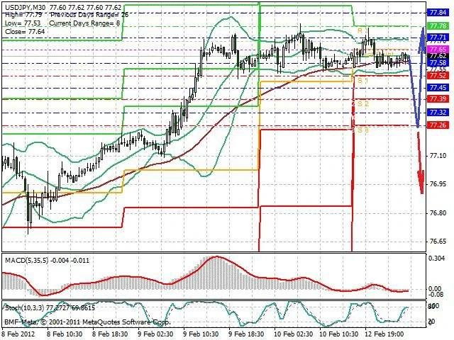 Předpokládaný pohyb pro dnešní den LONG. Případné vstupy do obchodu z hladiny 77.25 s předpokládaným cílem 77.75, případně až 78. Proražení hladiny 77.25 může vést k pohybu s pravděpodobným cílem 76.9 až 76.7.