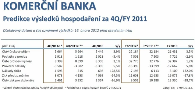 Z pohledu dosaženého celoročního čistého zisku byl rok 2011 zřejmě v případě KB nejhorším za posledních 5 let. Odpis hodnoty řeckých státních dluhopisů (očekáváme celkem 5,4 miliardy Kč) se do výsledku loni zakousl skutečně významně. Bez vlivu těchto odpisů by čistý zisk KB byl na historickém rekordu těsně pod 14miliardovou hranicí.