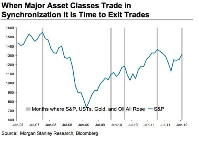 Měsíc, kdy posilují zároveň americké akcie, dluhopisy, zlato i ropy, může signalizovat vlnu výprodejů. Ukazuje to zajímavý graf vývoje indexu S&P 500 z dílny Morgan Stanley. V posledních pěti letech k tomu došlo několikrát (šedé oblasti grafu), a jen v jednom případě nepřišel výprodej na akciovém trhu. V každém případě stojí za pozornost, jak sporadicky takový všeobecný růst nastává. Pokud bychom ovšem vynechali dluhopisy, šedé barvy by v grafu výrazně přibylo.