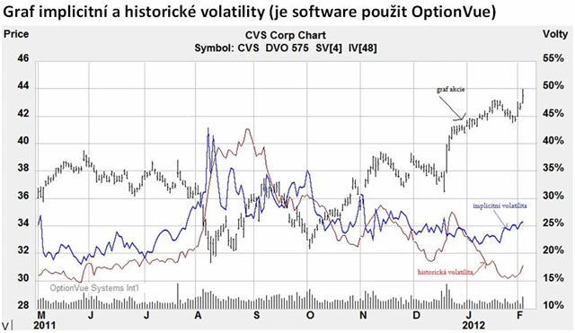 Akcie CVS Corporation s tickerem CVS se obchoduje v uptrendu. My bychom rádi spekulovali na další růst, ale nevíme, zda je pro nás výhodný jednoduchý nákup CALL opce. Abychom to zjistili, je potřeba vykreslit si graf volatility – jak historické, tak i implicitní. K tomu nám poslouží různé softwary nebo brokerské platformy. Nejedná se o nic složitého.