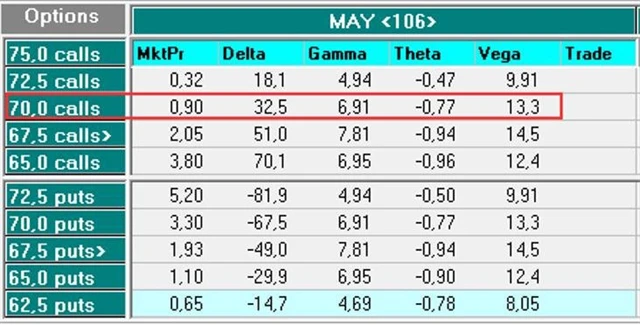 Co z těchto čísel plyne? Cena opce je 0,90 USD, delta je 32,5, gamma je 6,91, théta je -0,77 a vega je 13,3.