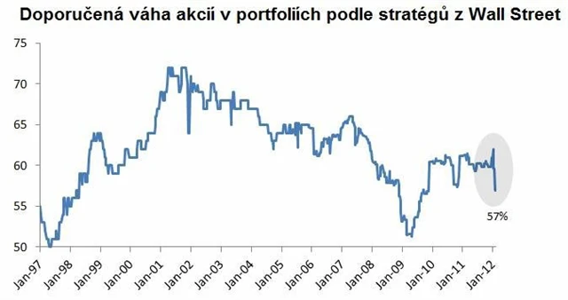 Vypadá to jako velké číslo, ale v historickém kontextu výzkumu, který se provádí již od roku 1997, je vidět, že se podíl doporučované složky akcií v portfoliích snižuje. Pokud by investoři měli věřit doporučením stratégů, dalo by se poslední číslo považovat za medvědí znamení. Je ovšem potřeba mít na paměti, že nejvyšší doporučovanou váhu dávali stratégové akciím na vrcholu internetové bubliny v roce 2001, a naopak nejméně jim věřili, když byly na dně po finanční krizi v roce 2009.