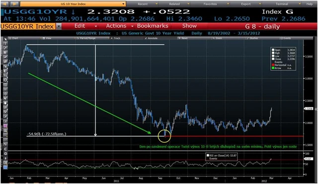 Hlavní důvod hledejme spíše v tom, že Fed zametá cestičku velkým bankám, které potřebují levné financování a vydělávat, aby mohly sanovat ztráty vzniklé z hypotéční krize. Banky v období únor 2011 až září 2011 levně nakoupily a potřebovaly protistranu, která již drahé dluhopisy koupí. A shodou okolností se objeví Fed, který operací Twist kupuje delší dluhopisy. A původní cíl držet dlouhodobé úrokové sazby nízko se během celé operace Twist nedaří, jelikož druhý den dosáhly výnosy svých minim (na grafu žluté kolečko). V posledních dnech výnos prudce roste. Že by banky většinu delších dluhopisů prodaly Fedu?