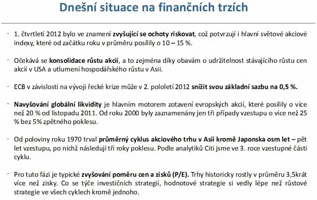 Snídaně s analytiky - nějaký ten toustík, šálek kávy a spousta informací pro ty, kdo jsou ochotní vstávat stejně brzy jako ranní bankovní ptáčata. Tento týden se na podobném setkání s analytiky Citibank mohli investoři dozvědět, čemu analytici této známé banky v současnosti, kdy akciové trhy rostou jako z vody, nejvíce věří.