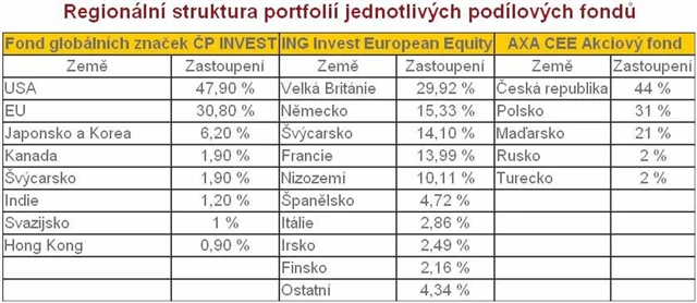 A jaké společnosti že to mají v portfoliích jednotlivých fondů největší zastoupení? Struktura portfolia pochopitelně odráží regionální zaměření jednotlivých fondů, kdy velké nadnárodní společnosti z USA najdete jen ve Fondu globálních značek ČP INVEST, na druhou stranu takový ČEZ je v globálním měřítku stále "malou" společností, a proto jej najdete pouze v portfoliu AXA CEE akciového fondu, který investuje výhradně v regionu střední a východní Evropy, kde má již ČEZ podstatně zvučnější jméno.