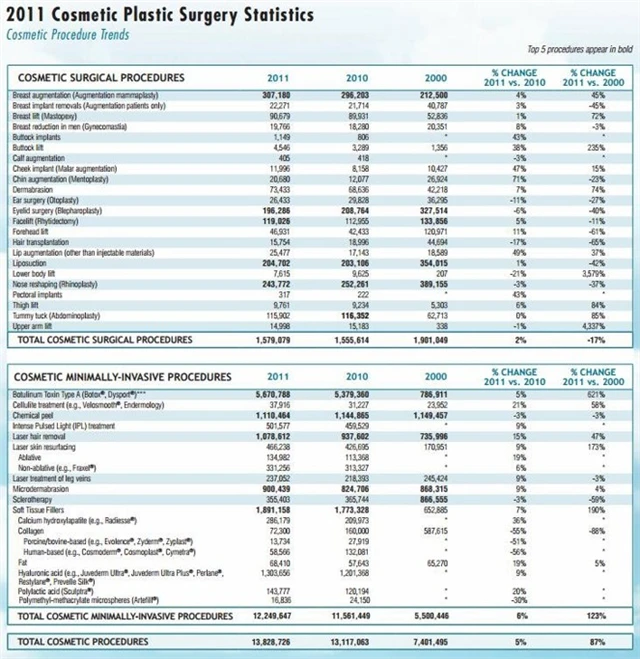 V USA bylo v roce 2011 provedeno celkem 13,8 milionu kosmetických plastických zákroků. 1,6 milionu připadlo na ty chirurgické, což podle roční statistiky Americké asociace plastických chirurgů představuje 5% nárůst oproti roku 2010 a druhý růstový rok v řadě po propadu v roce 2009 (tehdy poklesl počet všech kosmetických plastických procedur o 1 %, přičemž chirurgické zákroky propadly dokonce o 9 %).