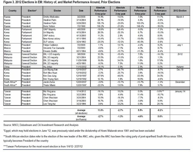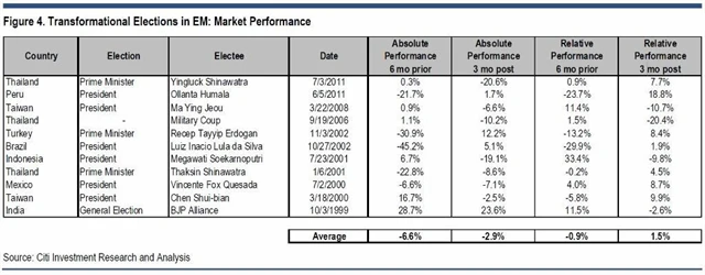 Pokud odhlédneme od Ruska, kde index vykazuje většinou nadprůměrnou výkonnost před volbami, zjistila Citi, že "volební" trhy mívají tendenci k lepší výkonnosti tři měsíce po volbách, kdy předčí "nevolební" GEM o 0,6 %, ve srovnání s -4,6 % v šesti měsících před volbami.